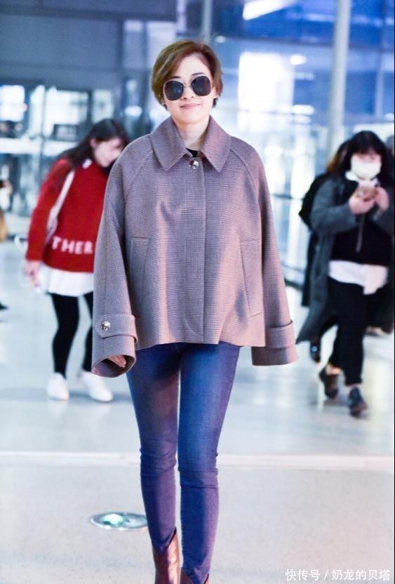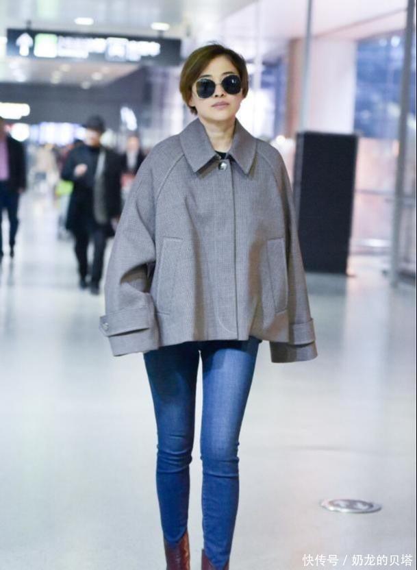 不得不说,这一身搭配确实很有个性,大衣宽松的廓形弱化了年龄感,翻领设计又衬得脖颈线条修长,袖口的金属扣细节让基础款瞬间有了亮点。下装选了紧身牛仔蓝长裤,利落裤型刚好中和了大衣的蓬松感。墨镜一戴,随性中透着精致,哪怕是赶行程也能美得毫不费力。这种“短款上衣+紧身裤”的组合,尤其适合想优化比例的中年女性,不会显臃肿,又能悄悄拉长腿部线条。